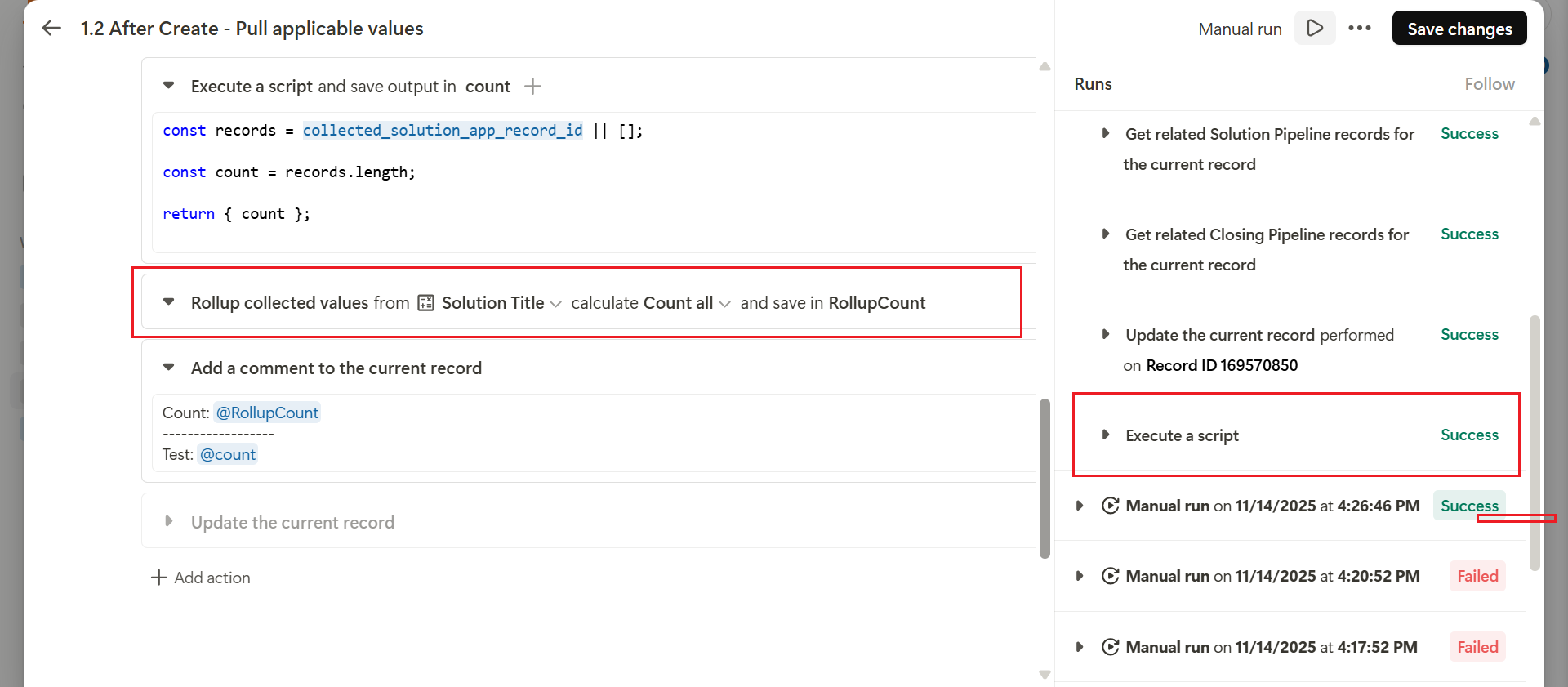 + Add actionand choose between various actions, for exampleUpdate recordorCreate PDF - Use the @-menu to add the variable for the “Rollup collected” action
