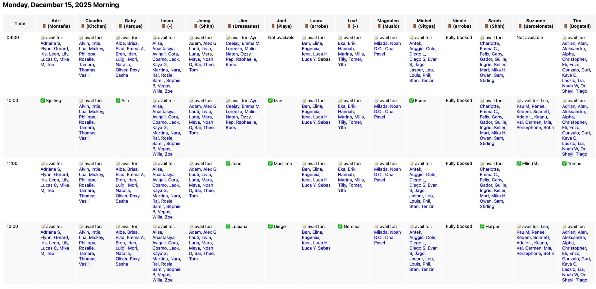 - for each time slot, a list of remaining available learners, each shown as a clickable link