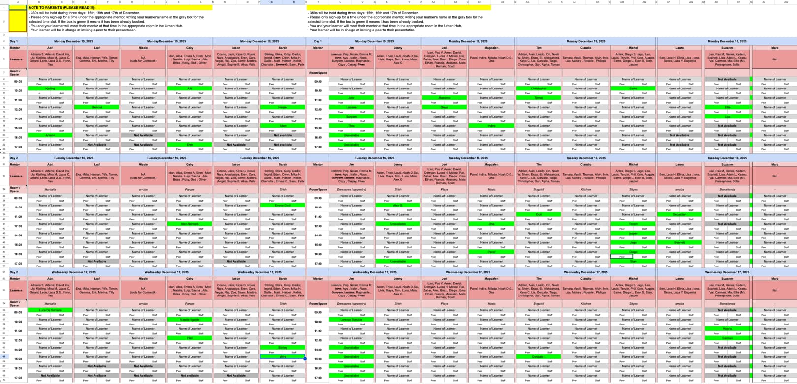This is something the original spreadsheet could not do reliably: as soon as someone is booked on one day, they simply disappear from the list of clickable learner links on the other days, so parents only ever see valid options.