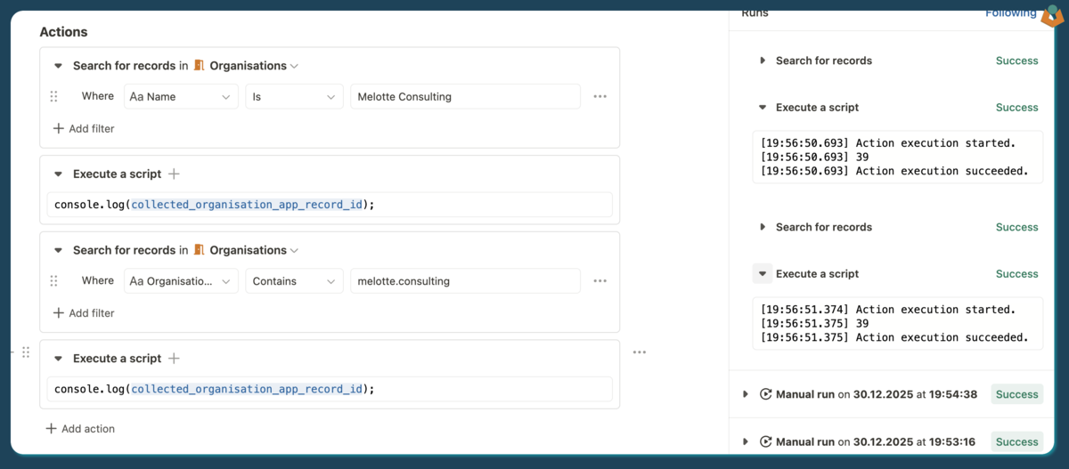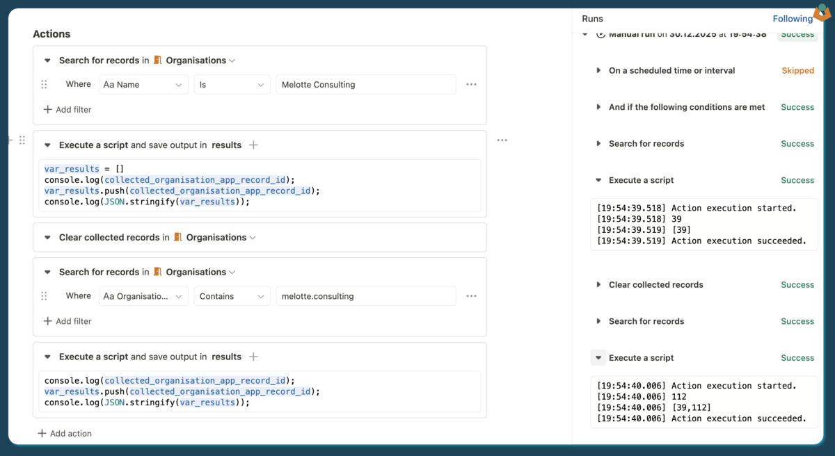 I found out, that two searches in sequence will result as only the result from the first search in variable “collected_unternehmen_app_record_id” … (I expected an array). Is also not the “unique” result, its really the result from the first search only.