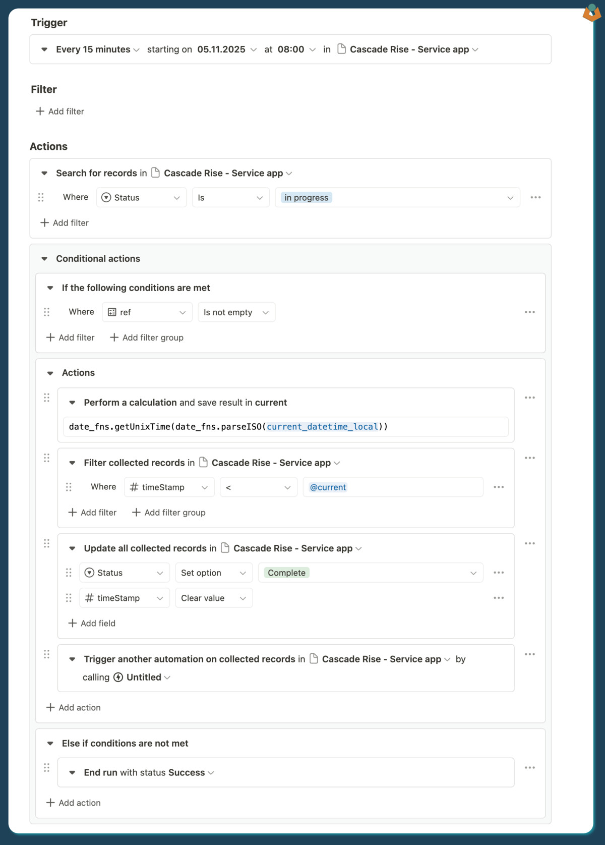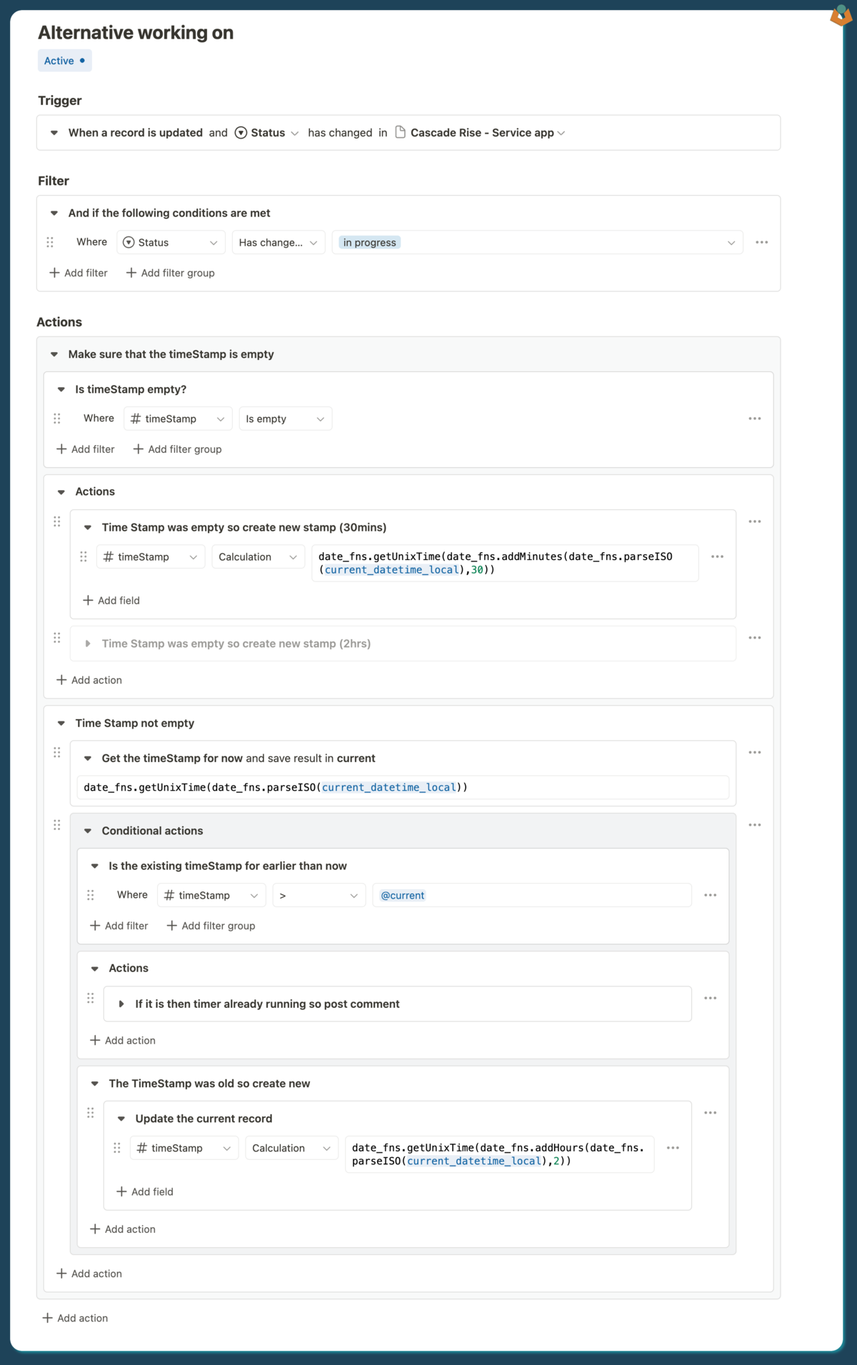 Also as single select fields it is possible to (re-set) a timer by mistake so we can build in some safety by checking for the existence of a time stamp and then checking to see if the timestamp is older than the now rather than still waiting to trigger: