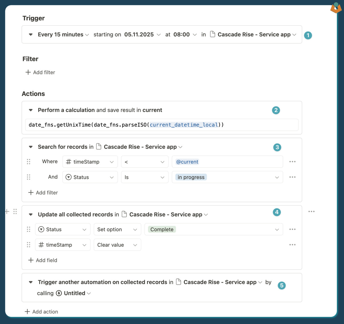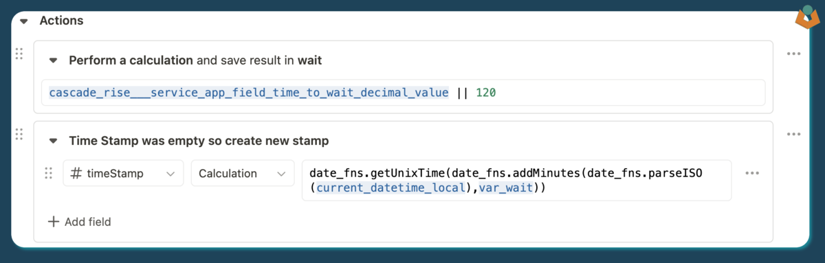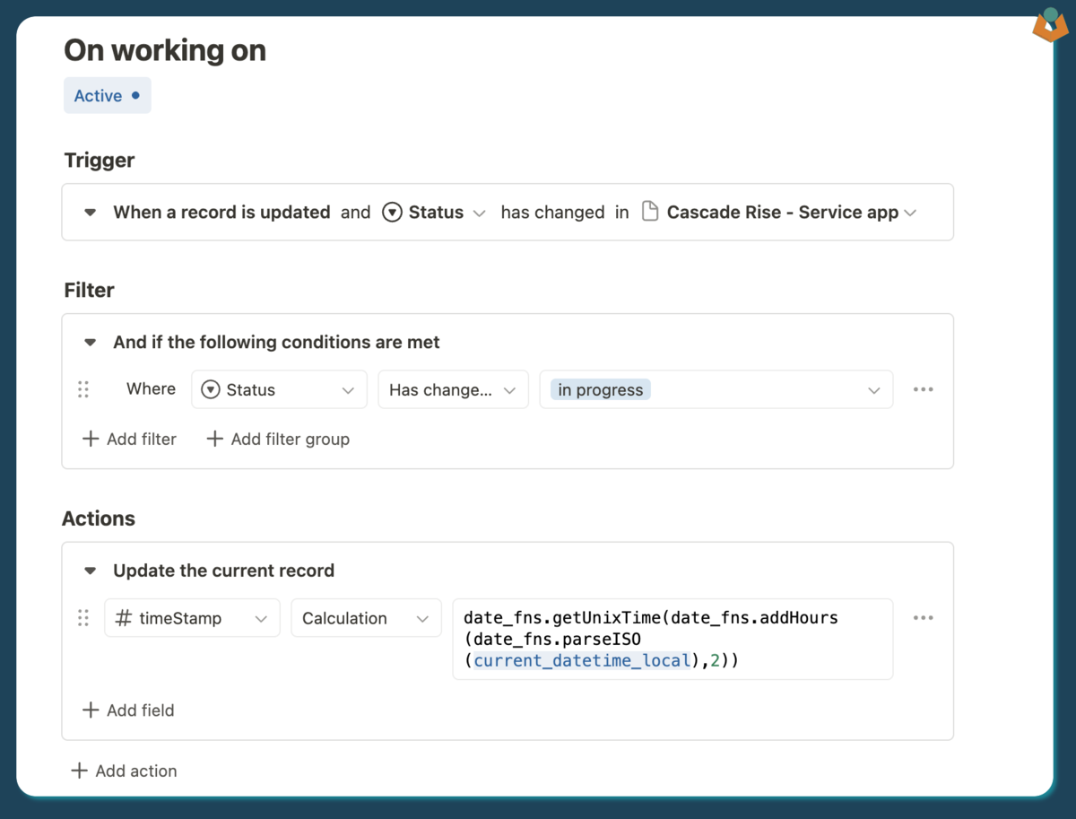 The automation gets triggered when the select field is changed and it adds 2hrs to the current time and then converts it to UNIX time (which is a number) and adds that to our hidden number field.