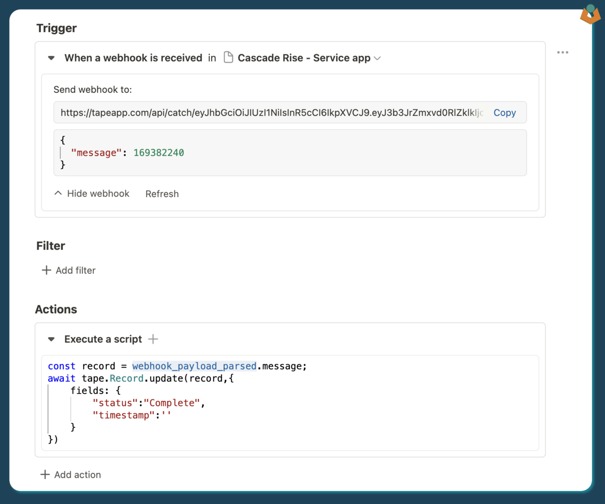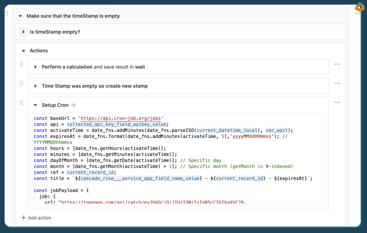 The first thing we need to do is give something to check against so we can check if the 2hrs is up. Logically this would be a date/time field with the time set to +2hrs from the time the field was set to x. However, when using ‘before date’ searches or filters in Automations, Tape only considers the date and not the time which means that approach won’t work.