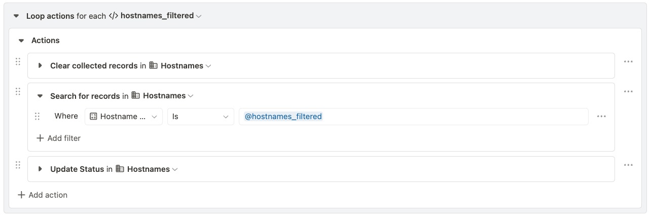 Use the āGet related recordsā automation to have all incoming records for that client/user. Then I filter out the records that are not on selectedhostnameids.